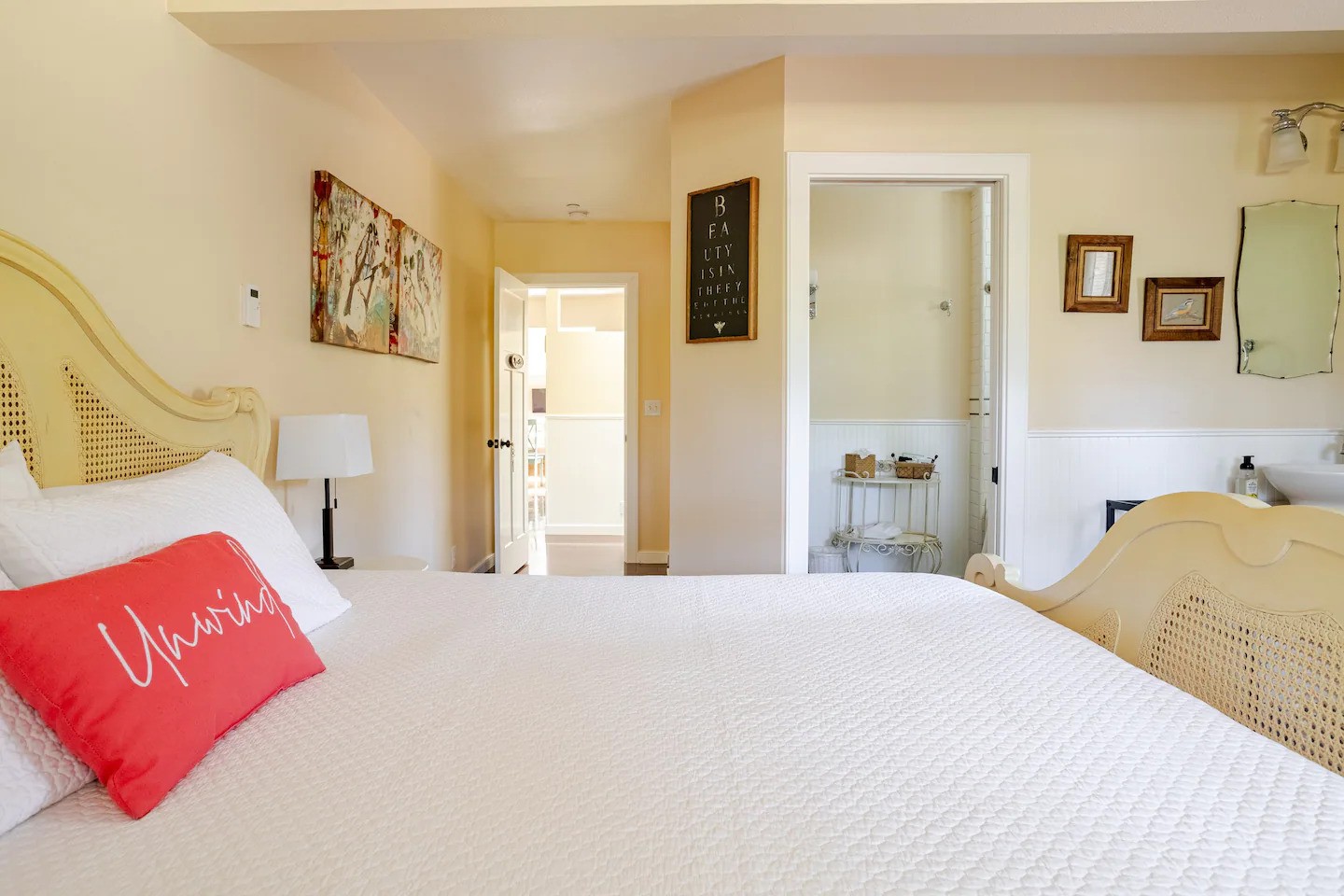 Creekside Haven's most popular suite, the Tom Cat Suite offers a queen size bed, private bathroom including a soaking tub/shower combo and easy access to the room through the back entrance of the house. All guests at Creekside Haven have full access to the property including the fully equipped commercial kitchen, dining room, 2 living rooms, reading nook and 2.5 acres of property to explore.